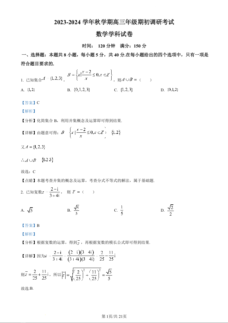 江苏省泰州中学2024届高三上学期期初调研考试数学(精品解析版)