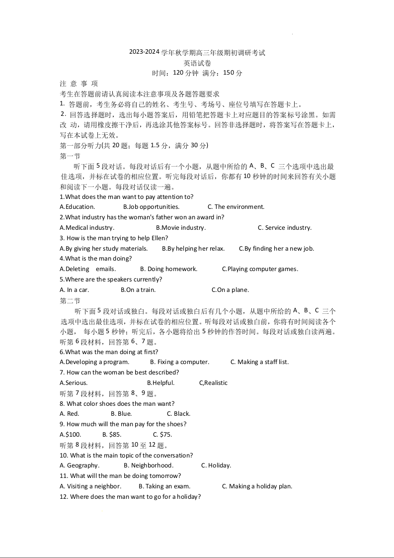 江苏省泰州中学2024届高三上学期期初调研考试英语