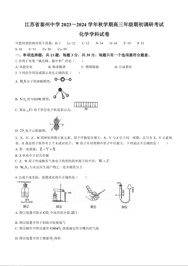 江苏省泰州中学2024届高三上学期期初调研考试化学