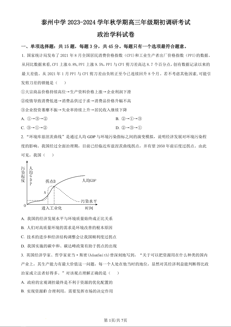 江苏省泰州中学2024届高三上学期期初调研考试政治(原卷版)