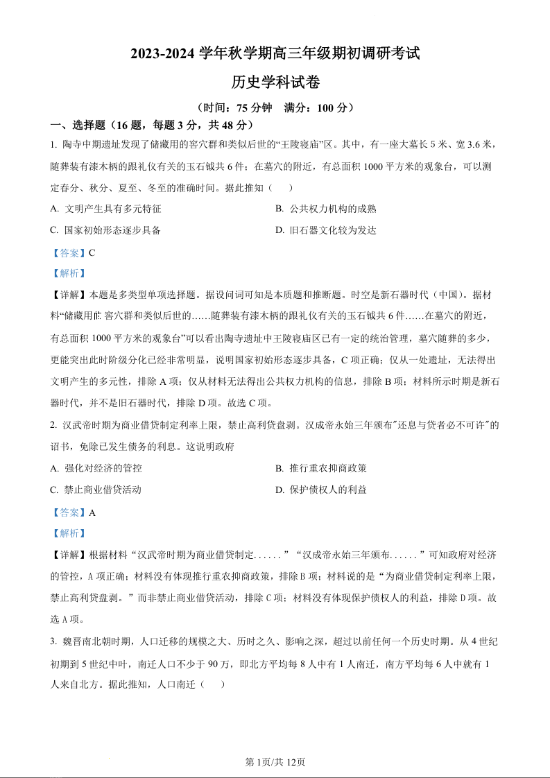 江苏省泰州中学2024届高三上学期期初调研考试历史(精品解析版)