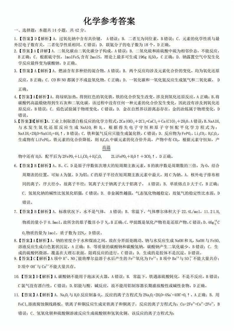 安徽省皖江名校2024届高三10月阶段性考试化学答案