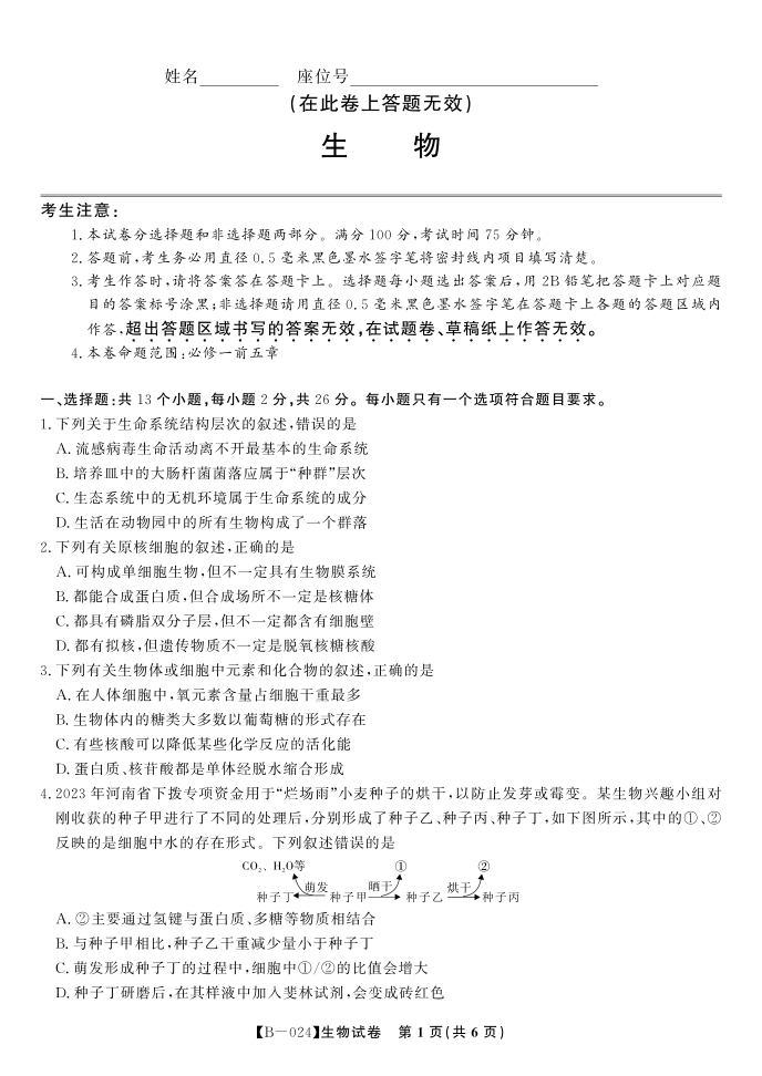 安徽省皖江名校2024届高三10月阶段性考试生物