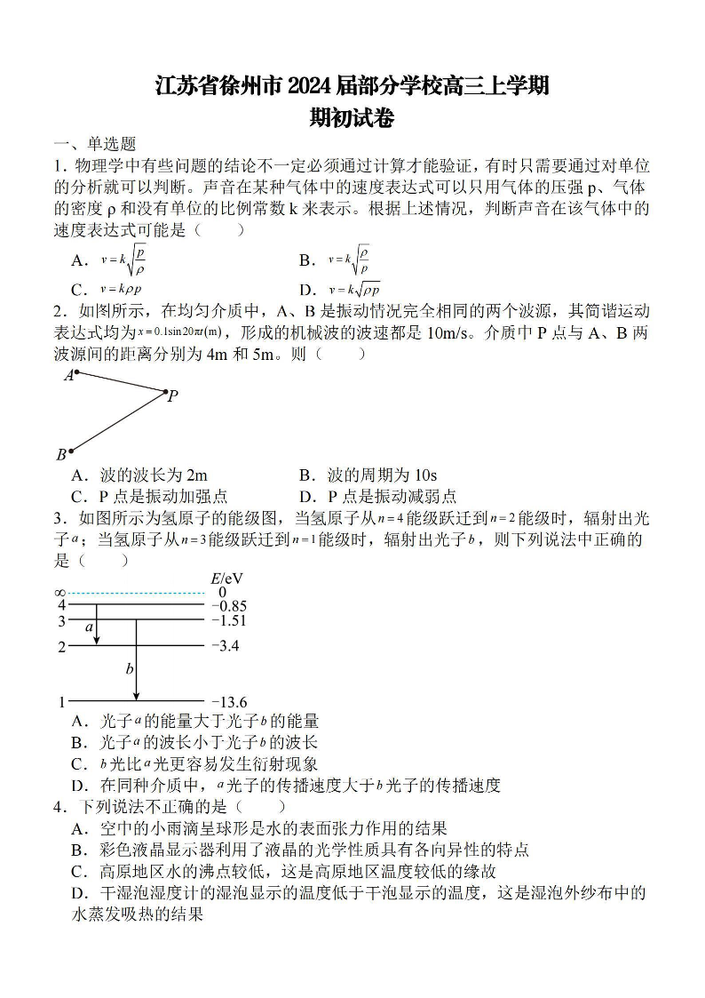 江苏省徐州部分学校24届9月期初考试物理+答案