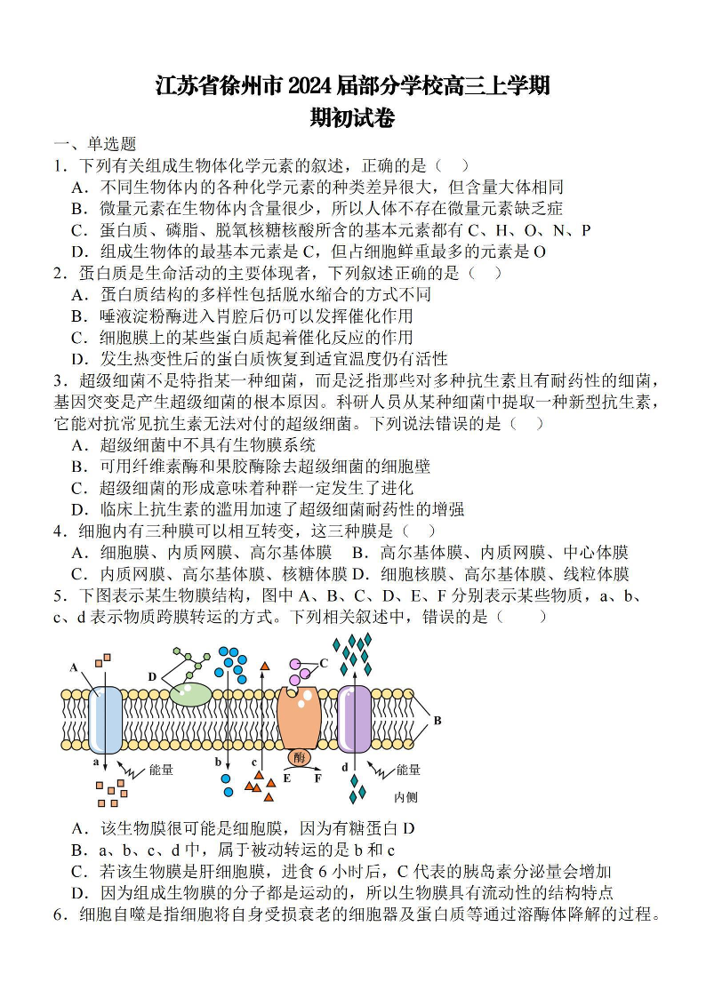 江苏省徐州部分学校24届9月期初考试生物+答案
