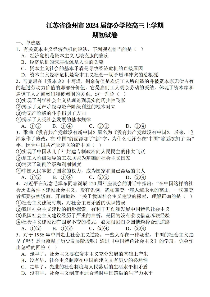 江苏省徐州部分学校24届9月期初考试政治+答案