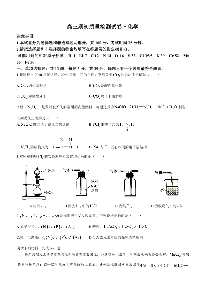 江苏省镇江地区2024届高三上学期期初考试化学+答案