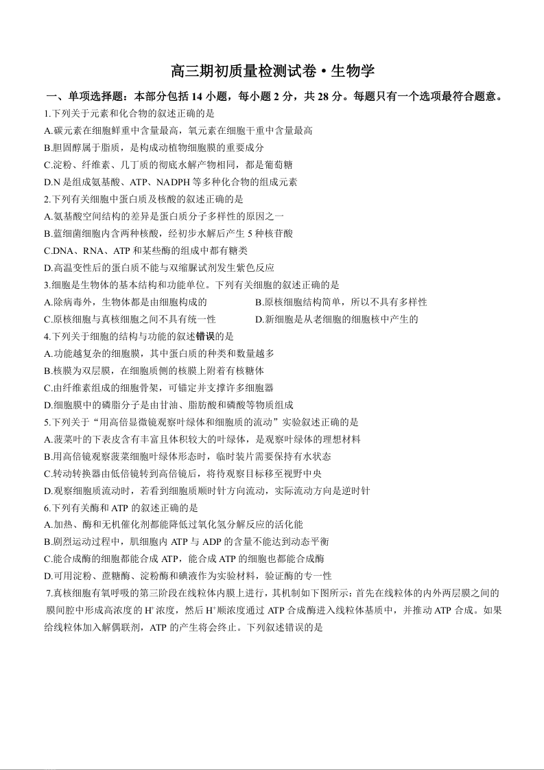 江苏省镇江地区2024届高三上学期期初考试生物+答案