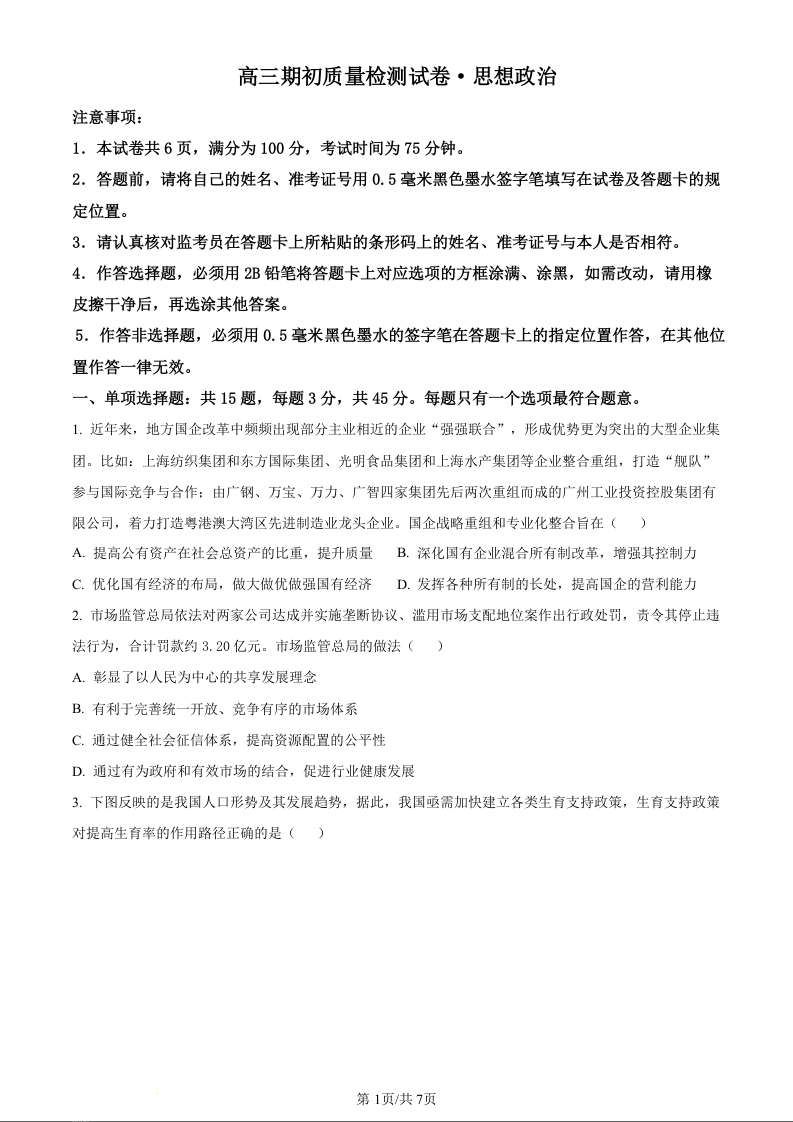 江苏省镇江地区2024届高三上学期期初考试政治(原卷版)