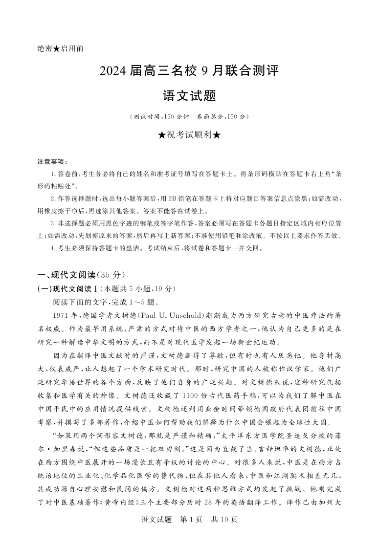 江西省2024届高三名校9月联合测评语文