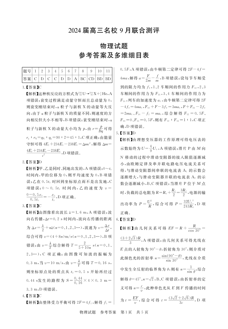 江西省2024届高三名校9月联合测评物理答案