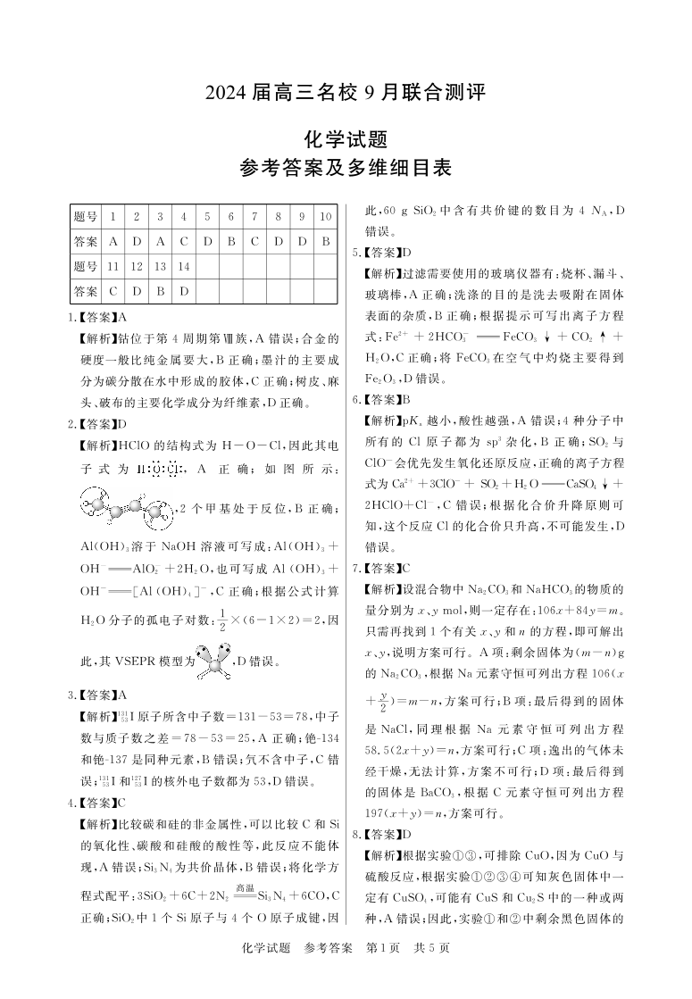 江西省2024届高三名校9月联合测评化学答案