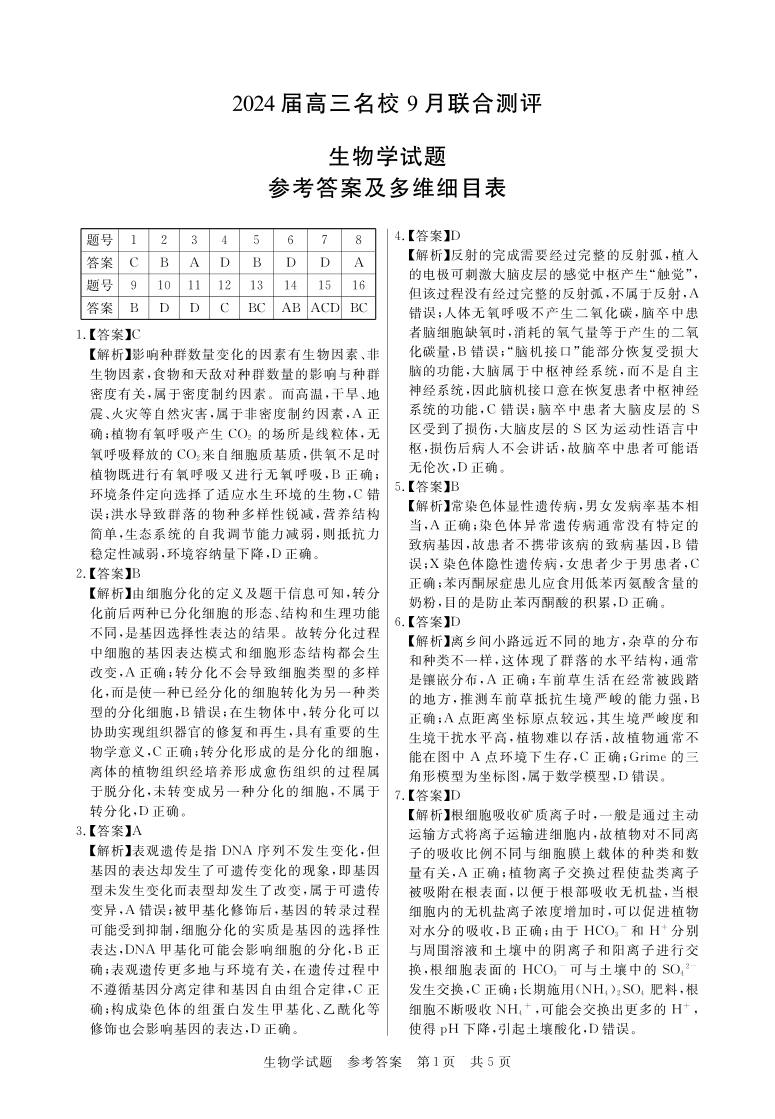 江西省2024届高三名校9月联合测评生物答案