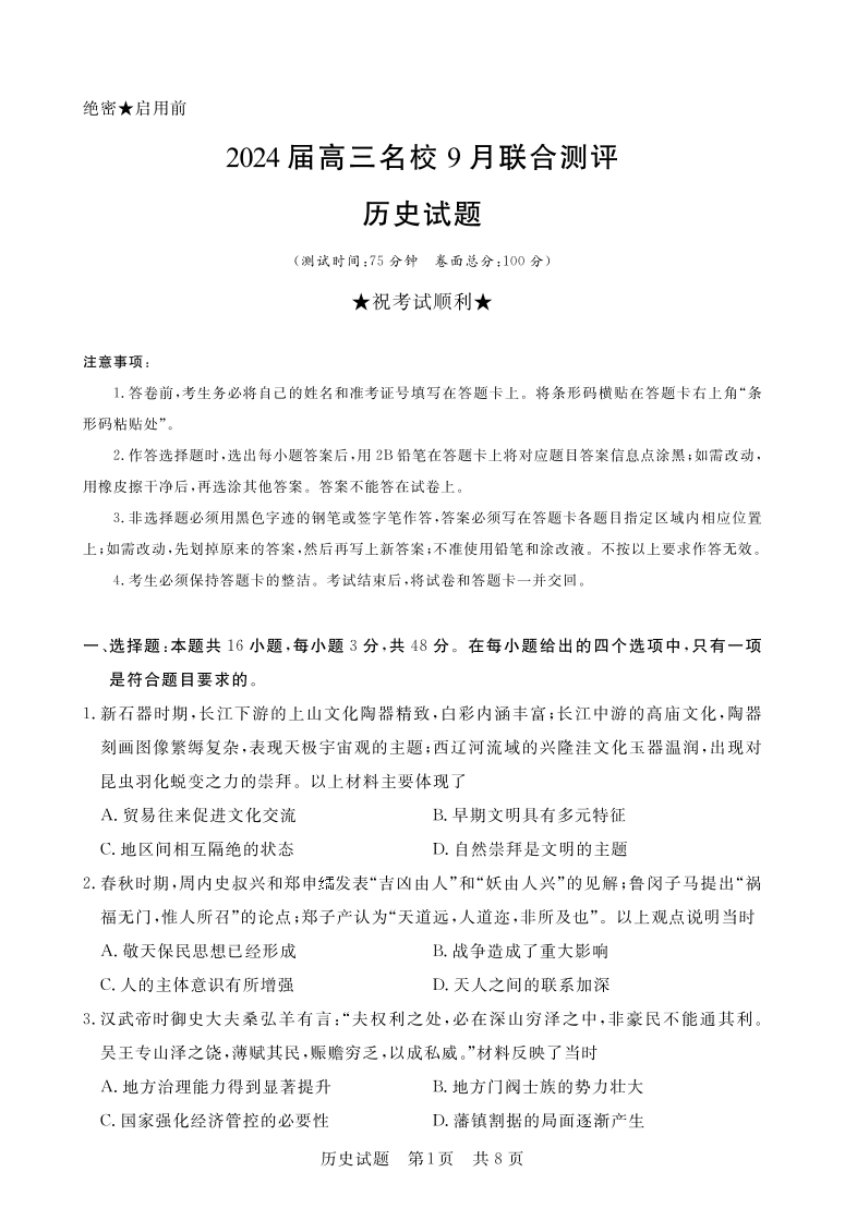 江西省2024届高三名校9月联合测评历史