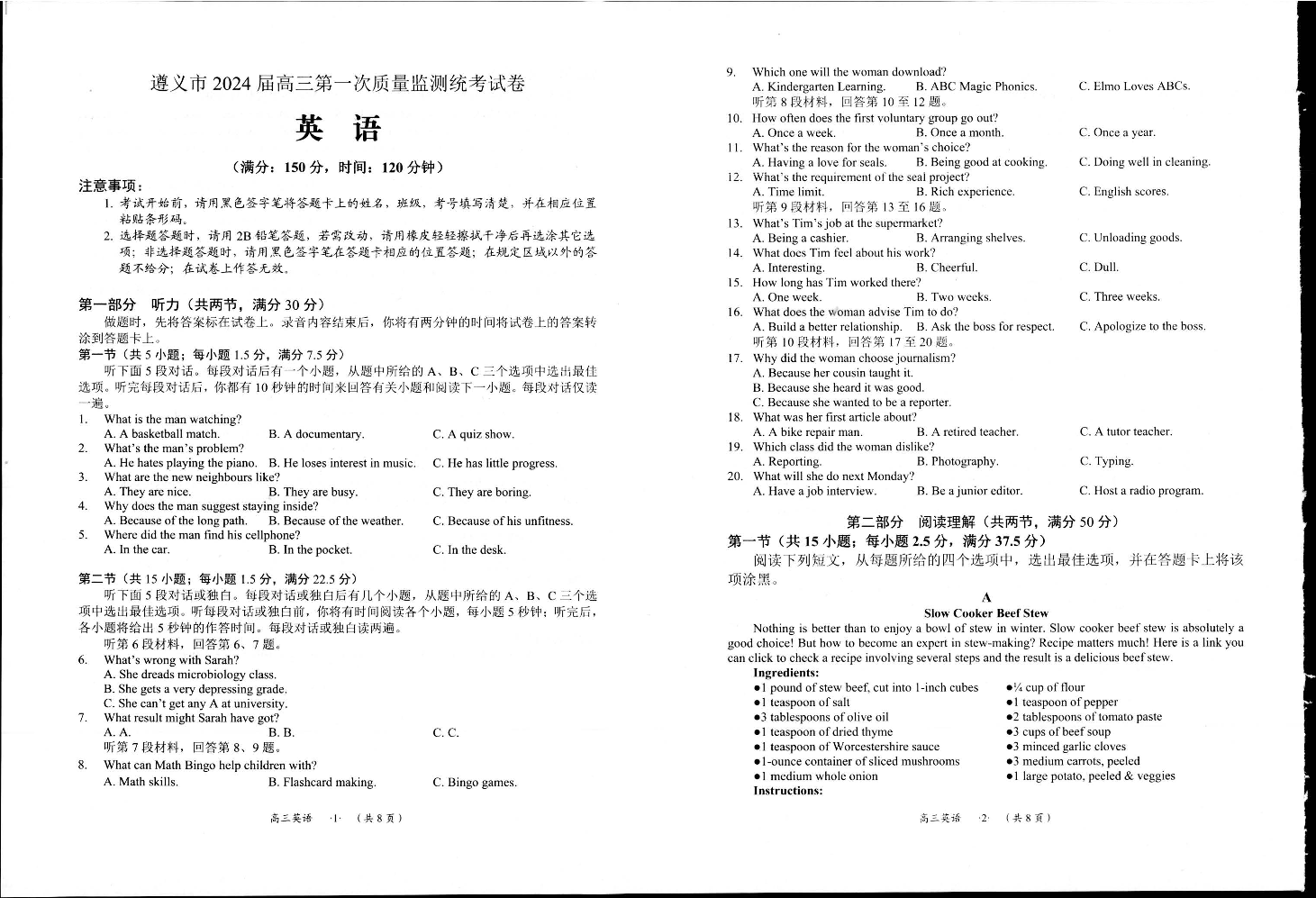 贵州省遵义市2024届高三上学期第一次市质量监测英语