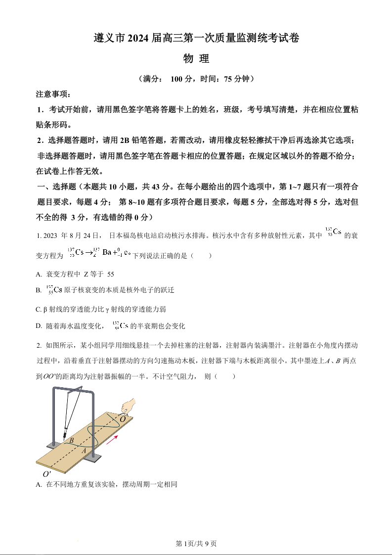 贵州省遵义市2024届高三上学期第一次市质量监测物理(原卷版)
