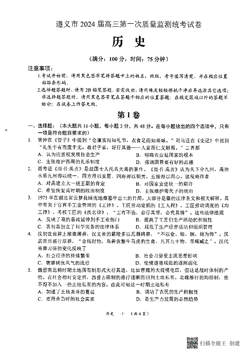 贵州省遵义市2024届高三上学期第一次市质量监测历史