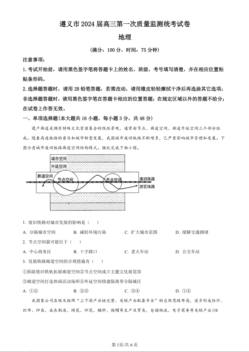 贵州省遵义市2024届高三上学期第一次市质量监测地理(原卷版)