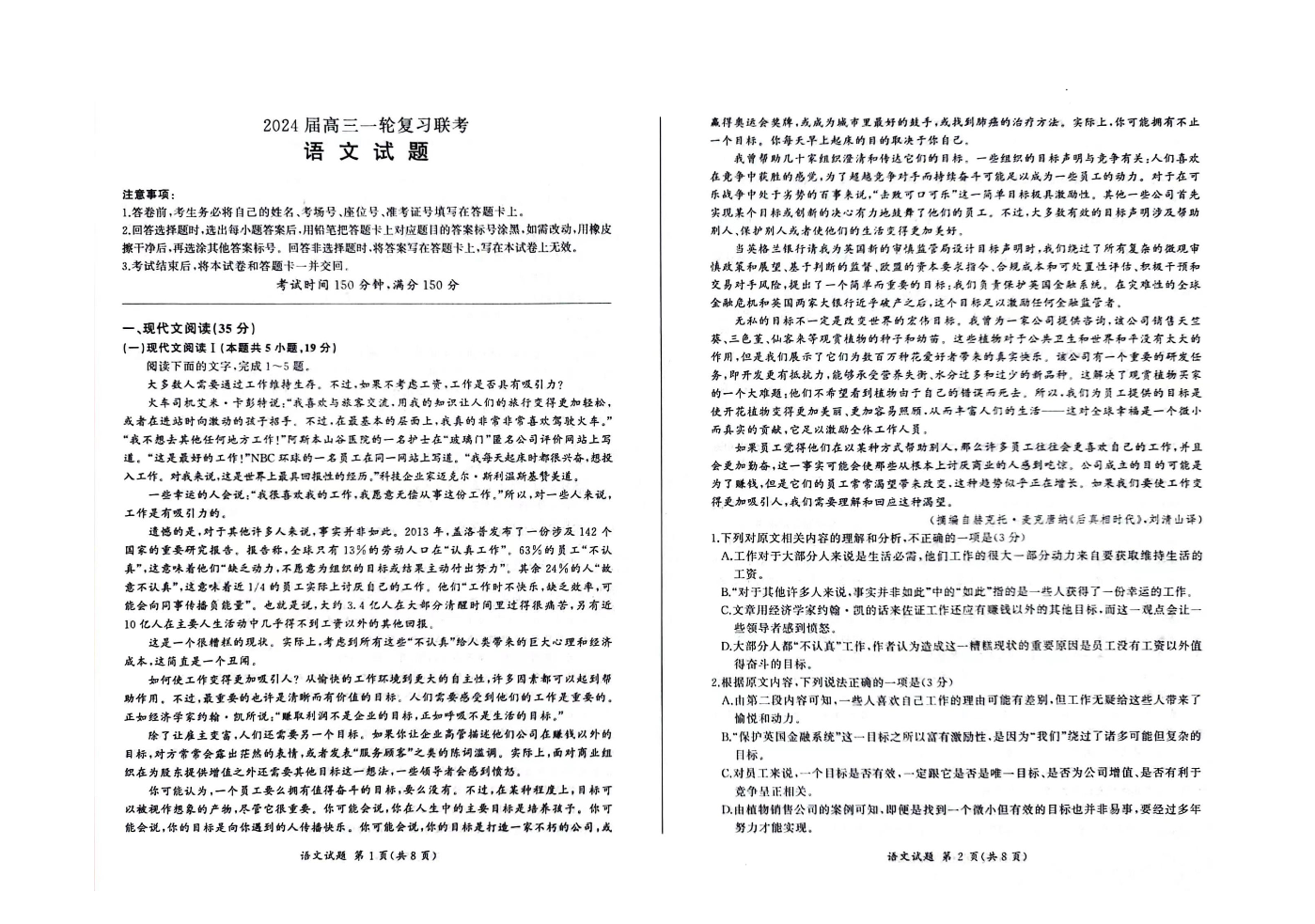 江西省百师联盟2024届高三上学期一轮复习联考试题语文+答案