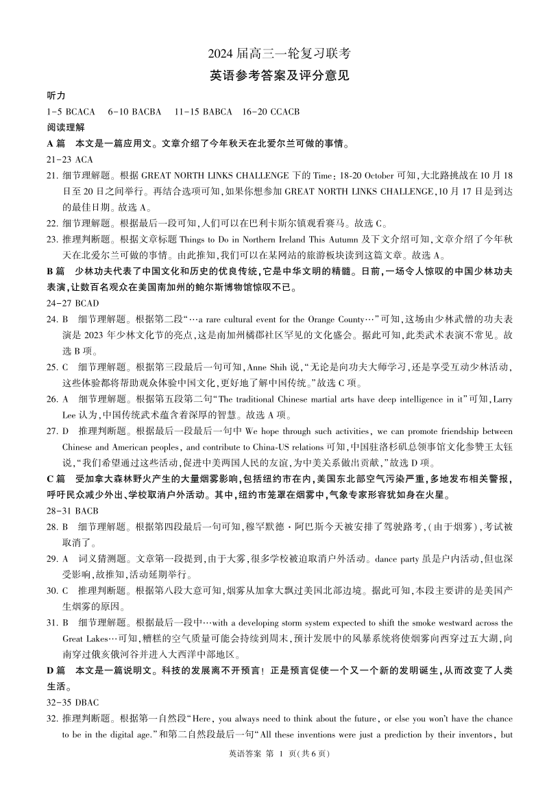 江西省百师联盟2024届高三上学期一轮复习联考试题英语答案