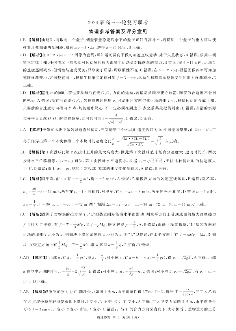 江西省百师联盟2024届高三上学期一轮复习联考试题物理答案