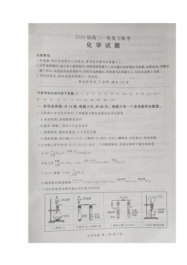 江西省百师联盟2024届高三上学期一轮复习联考试题化学+答案