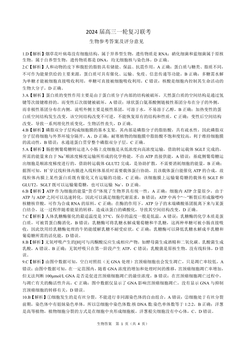 江西省百师联盟2024届高三上学期一轮复习联考试题生物答案