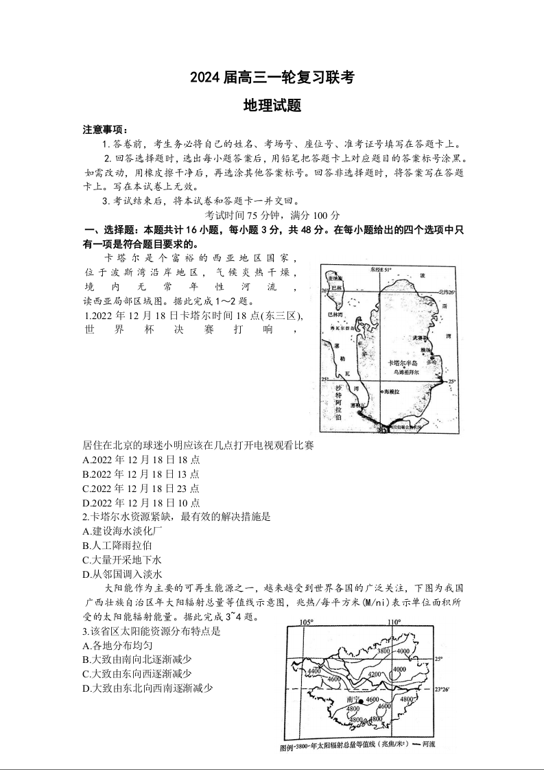 江西省百师联盟2024届高三上学期一轮复习联考试题地理+答案