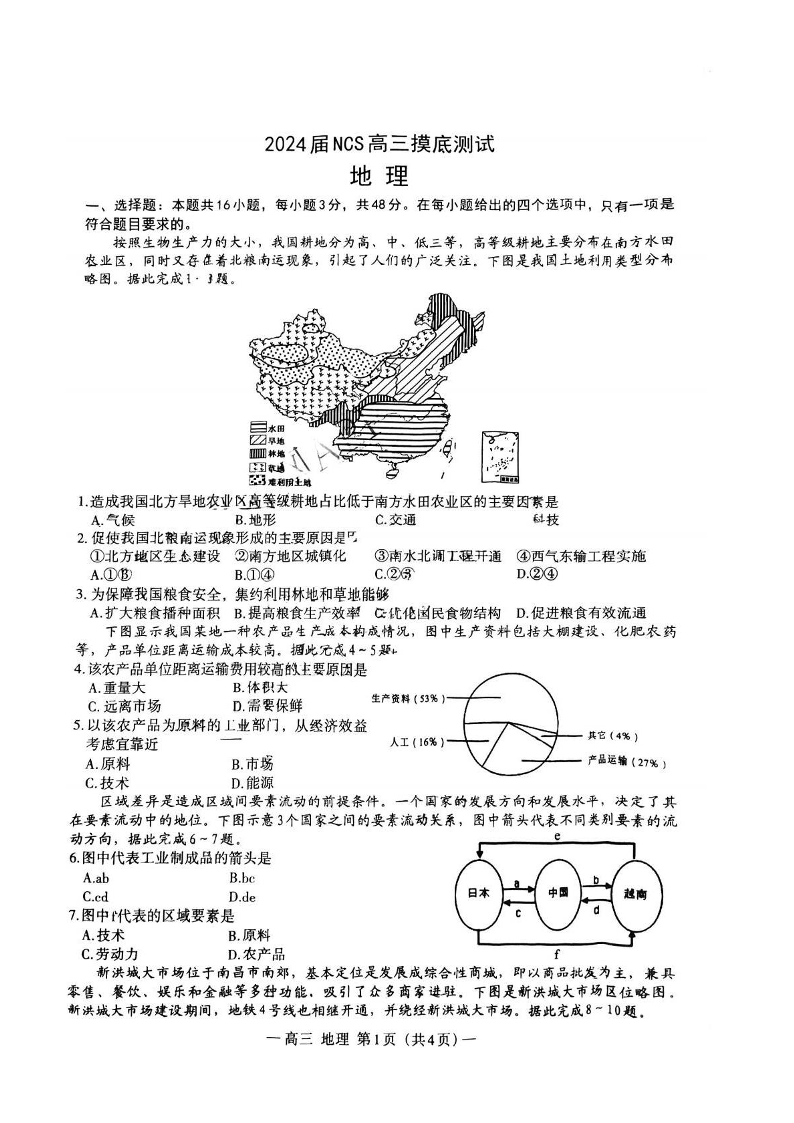 江西省南昌市2024届高三零诊地理