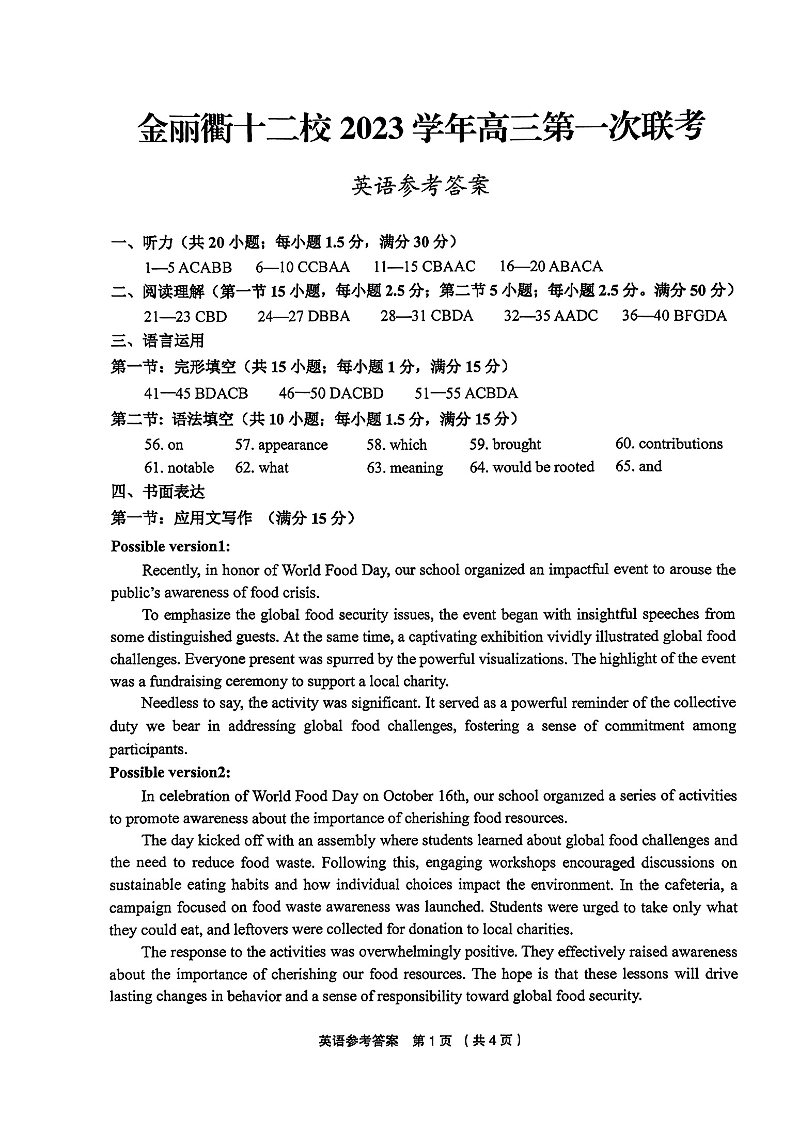 浙江省金丽衢十二校2024届高三上学期12月联考英语答案