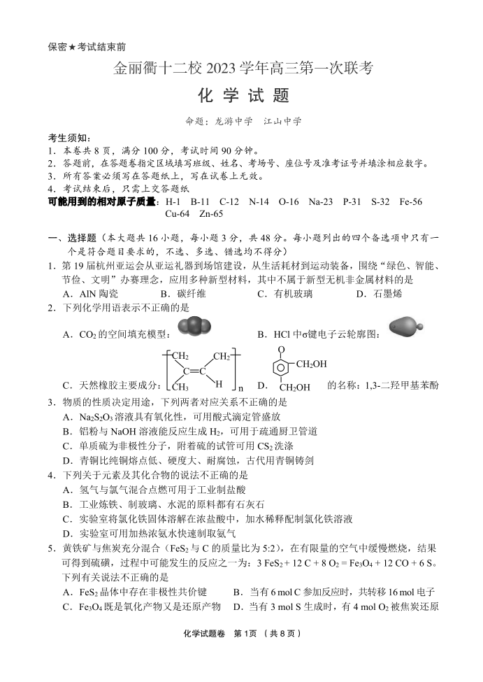 浙江省金丽衢十二校2024届高三上学期12月联考化学