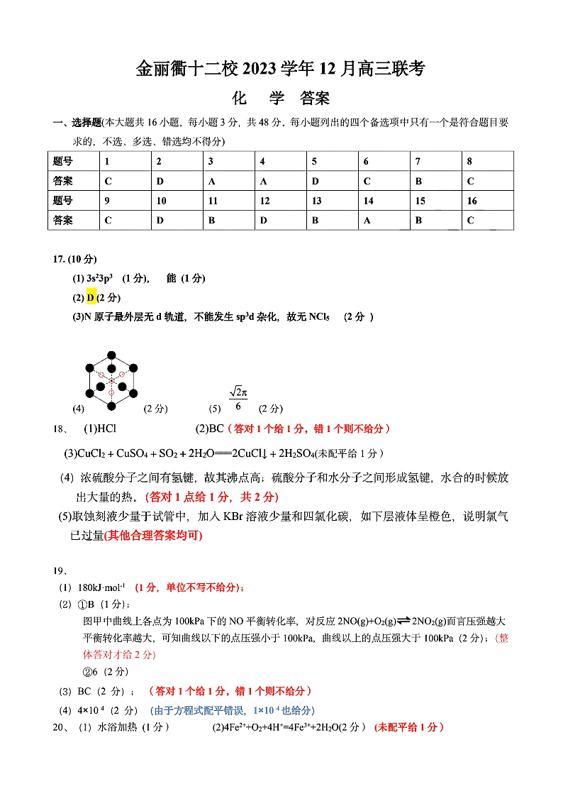 浙江省金丽衢十二校2024届高三上学期12月联考化学答案