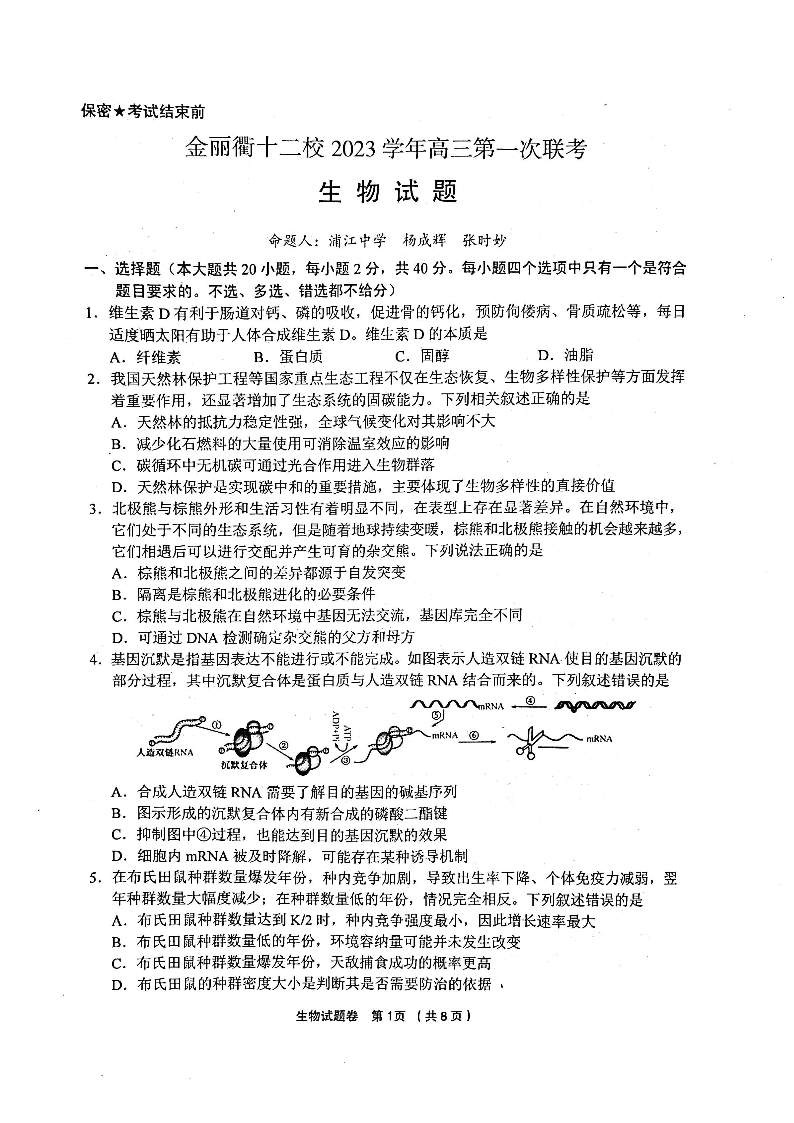 浙江省金丽衢十二校2024届高三上学期12月联考生物
