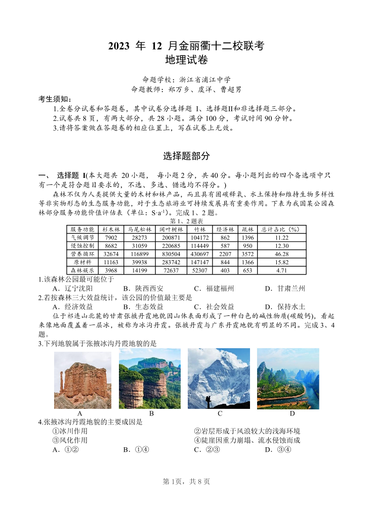 浙江省金丽衢十二校2024届高三上学期12月联考地理