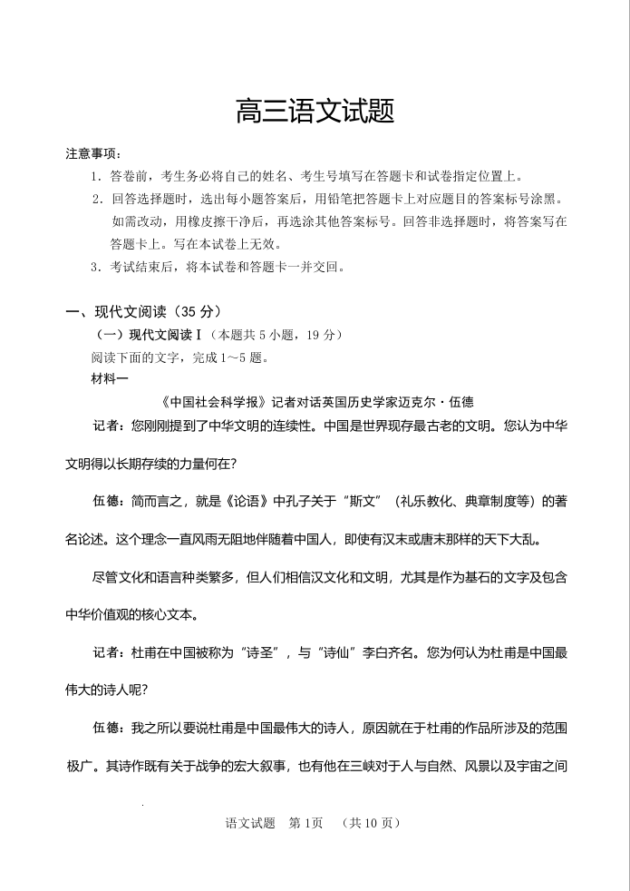 山东省泰安肥城市2024届高三上学期9月阶段测试语文