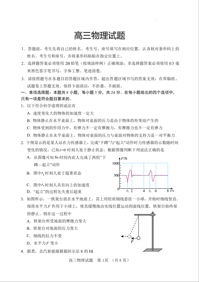 山东省泰安肥城市2024届高三上学期9月阶段测试物理