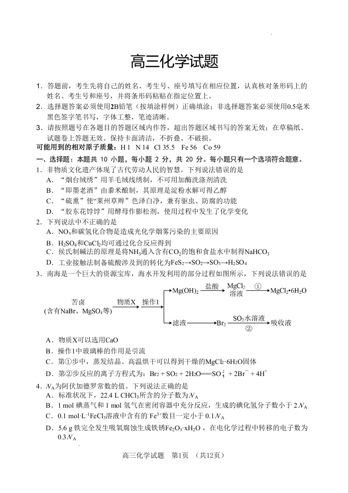 山东省泰安肥城市2024届高三上学期9月阶段测试化学