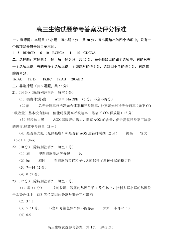 山东省泰安肥城市2024届高三上学期9月阶段测试生物答案