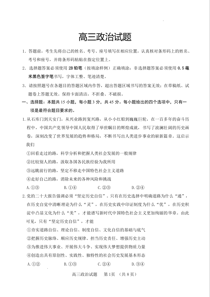 山东省泰安肥城市2024届高三上学期9月阶段测试政治