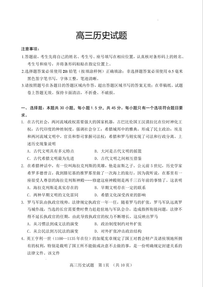山东省泰安肥城市2024届高三上学期9月阶段测试历史