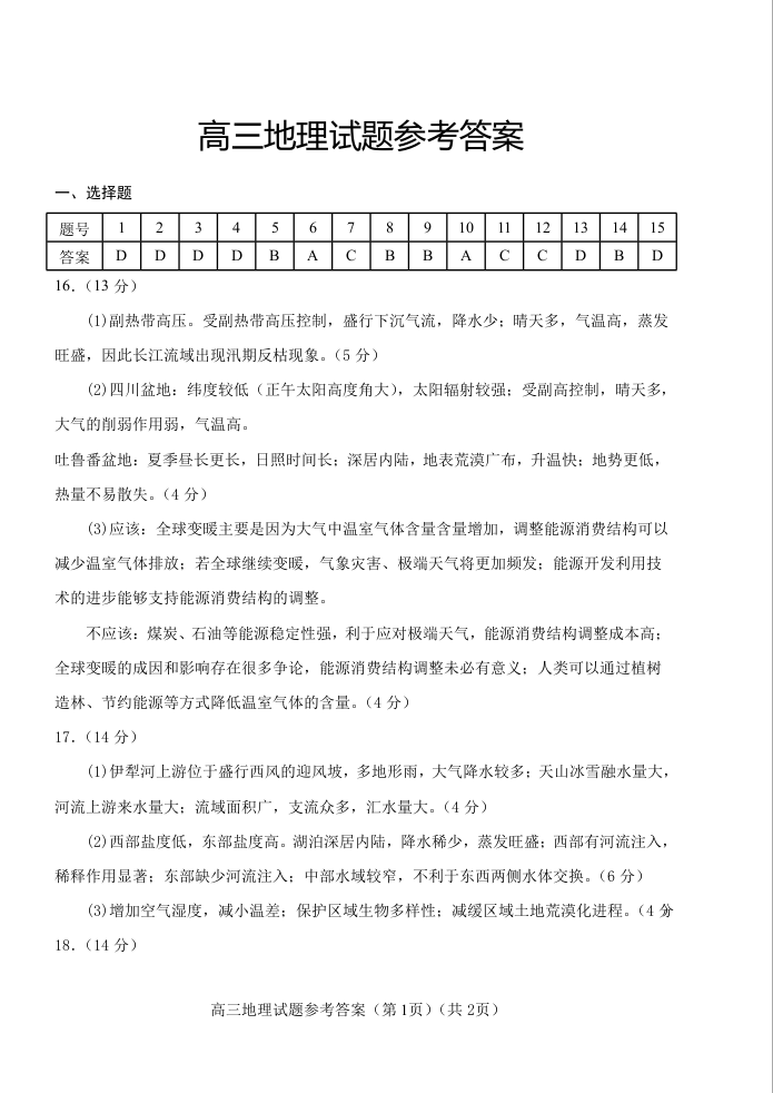 山东省泰安肥城市2024届高三上学期9月阶段测试地理答案