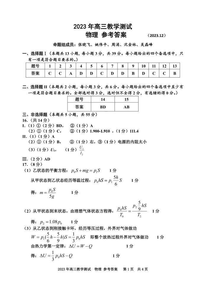 浙江省嘉兴市2024届高三上学期12月一模教学测试物理答案
