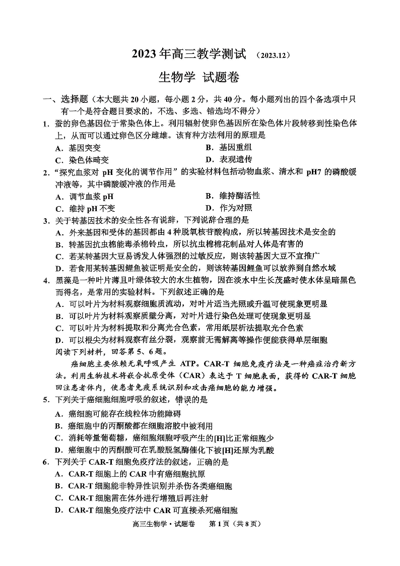 浙江省嘉兴市2024届高三上学期12月一模教学测试生物
