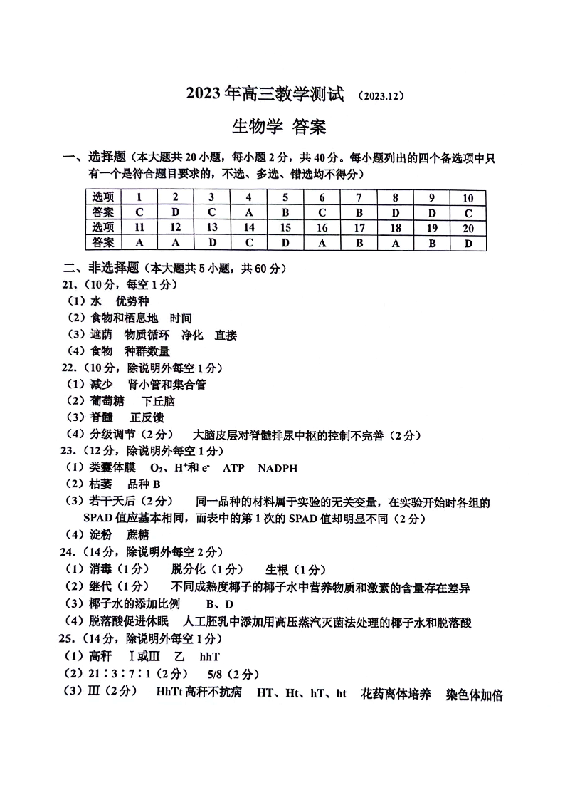 浙江省嘉兴市2024届高三上学期12月一模教学测试生物答案
