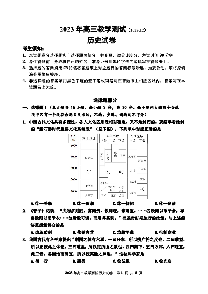 浙江省嘉兴市2024届高三上学期12月一模教学测试历史
