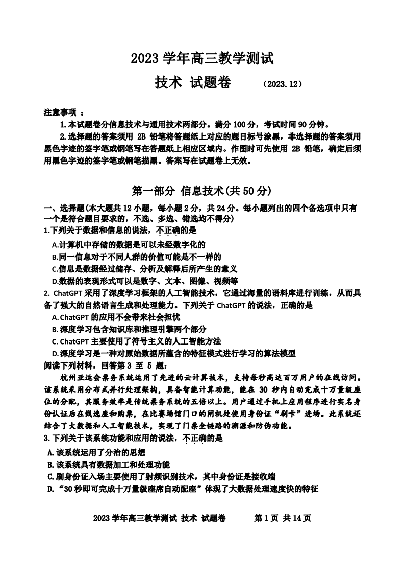浙江省嘉兴市2024届高三上学期12月一模教学测试技术