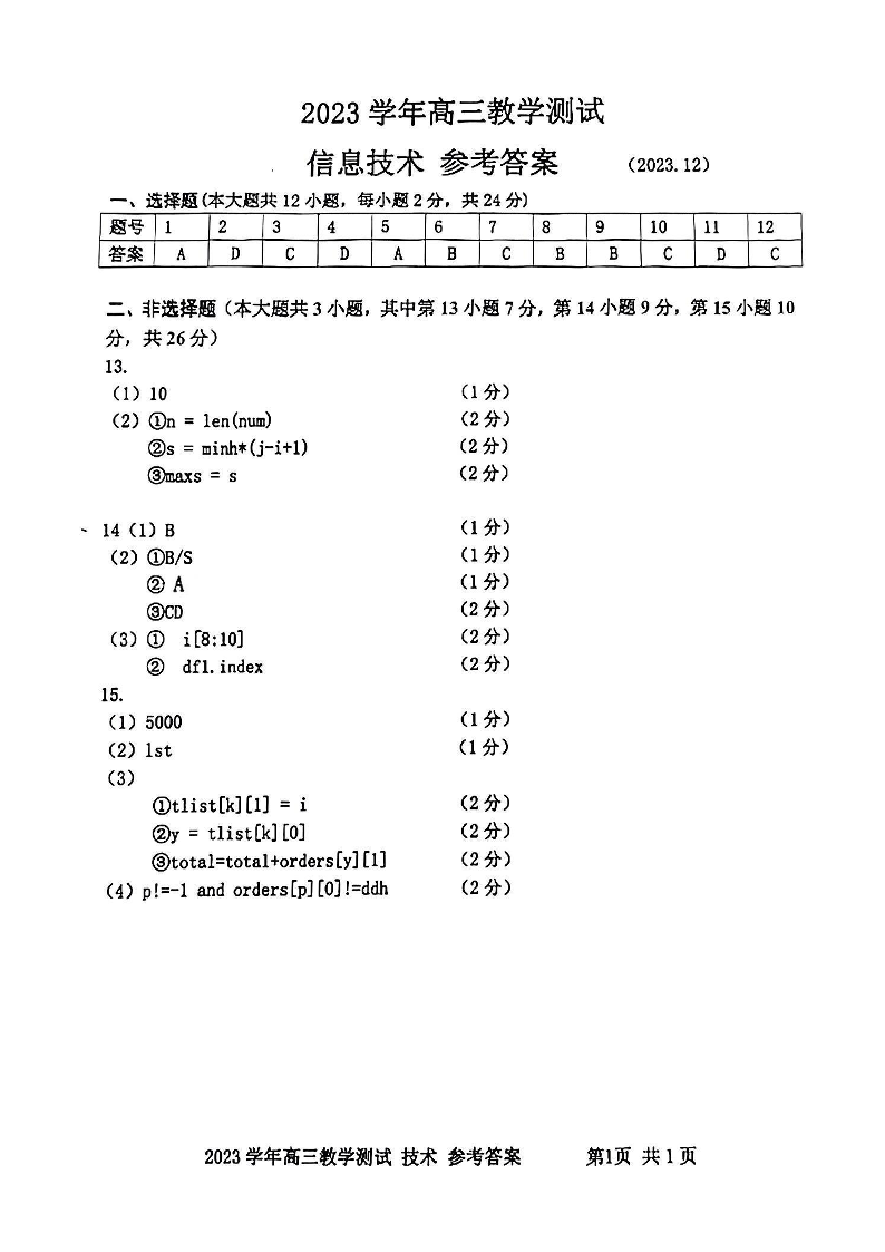 浙江省嘉兴市2024届高三上学期12月一模教学测试技术答案