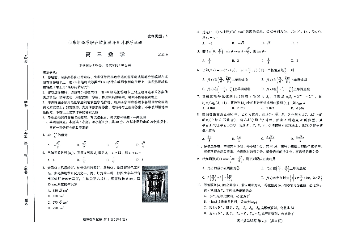 山东省新高考联合质量测评2024届高三上学期开学联考数学
