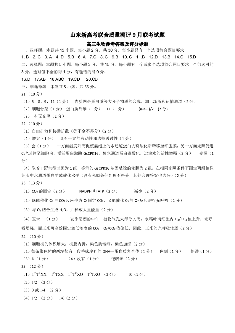 山东省新高考联合质量测评2024届高三上学期开学联考生物答案