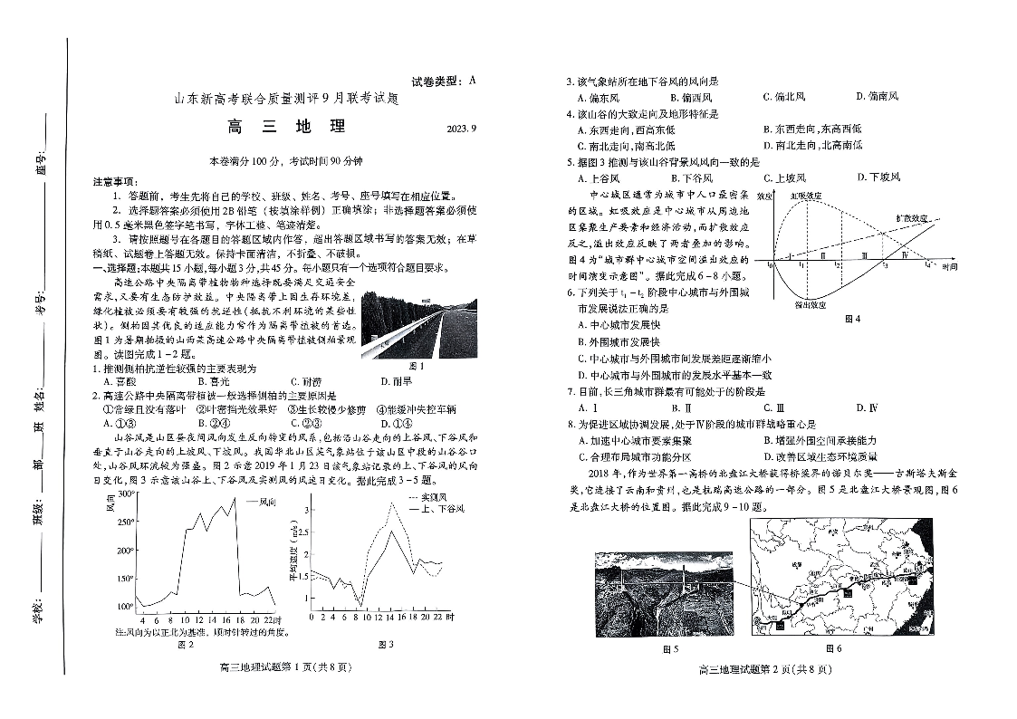 山东省新高考联合质量测评2024届高三上学期开学联考地理